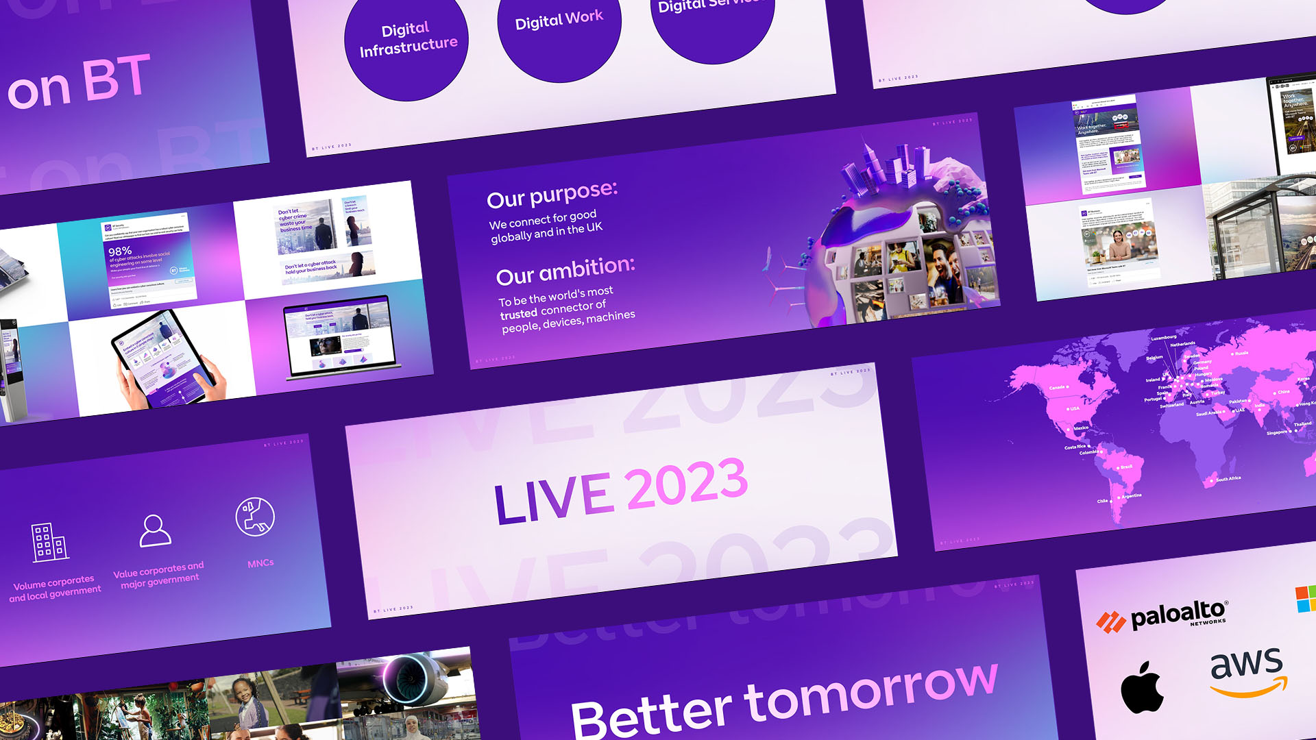 BT Live Presentation This presentation was designed for 5ft wide screens for BTs annual event to bring their employees together. BT ENTERPRISE Motion Graphics A motion graphics piece created for a 360 screen suspending over an exhibition area.